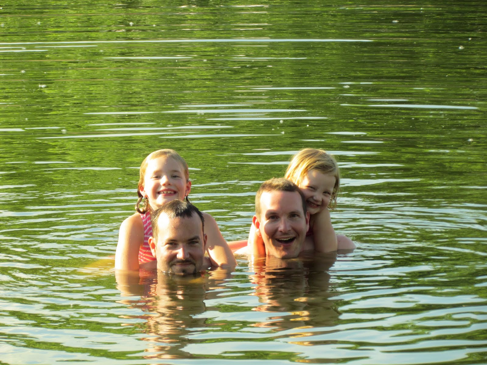 This evening we headed out to the Luster's cabin in Cedar Creek to play at the lake. Evelyn had been looking forward to fishing with Uncle Matt, which got Julia excited for fishing. Naturally, Evelyn had more patience when it came to fishing, but Julia thought it was fun, too. Evelyn caught some blue gill and a small catfish, but she caught more bass than anything else...here she is with her first catch. Like I said, Julia wasn't as patient with fishing as Evelyn, so she decided to go for a swim with Uncle Matt and Grandma Luster. She loved tooling around in the water, as long as someone was holding her. She absolutely refused to put her feet down while in the water.