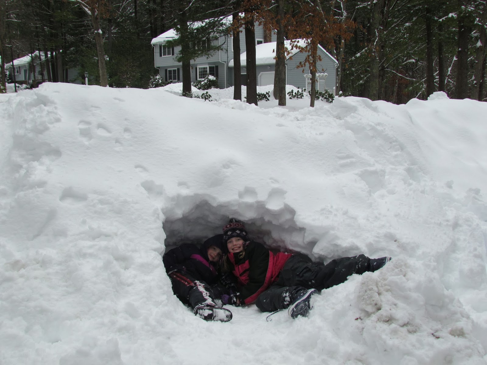 They brought shovels to the creek-side (not street-side) of the snow pile and dug out a little fort. They look as snug as a bug in there.